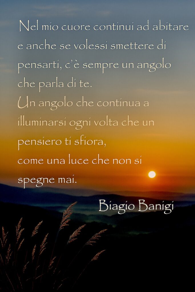 Nel mio cuore continui ad abitare e anche se volessi smettere di pensarti, c’è sempre un angolo che parla di te. Un angolo che continua a illuminarsi ogni volta che un pensiero ti sfiora, come una luce che non si spegne mai.